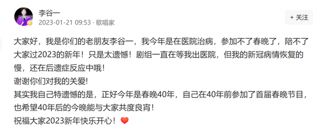 李谷一在文中说,“大家好,我是你们的老朋友李谷一,我今年是在医院治病,参加不了春晚了,陪不了大家过2023的新年!只是太遗憾!剧组一直在等我出医院,但我的新冠病情恢复的慢,还在后遗症反应中哦!