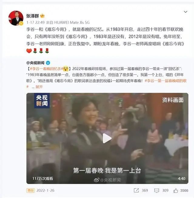 此前,央视主持人张泽群曾在微博上透露,由于刚刚“阳康”,身体抱恙的李谷一只能缺席兔年春晚。期盼龙年春晚,李谷一老师再度唱响《难忘今宵》。